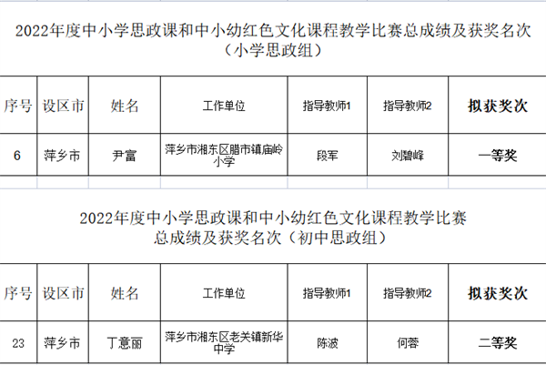 近日,在中共江西省委教育工委、江西省教育廳、江西省人力資源和社會保障廳聯(lián)合主辦的“2022年度江西省大中小學思政課和紅色文化課程比賽”中傳來喜訊,湘東區(qū)臘市鎮(zhèn)廟嶺小學尹富老師榮獲“小學組”一等獎(全市唯一),湘東區(qū)老關鎮(zhèn)新華中學丁意麗榮獲“中學組”二等獎。
