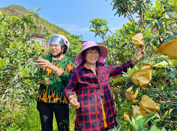 果園深處,71歲的鐘水平正指導村民套袋。這位有著多年果樹種植經驗的“土專家”,如今成了合作社的“首席技術員”,負責果樹剪枝、除草、施肥、病蟲害防治等?!靶藜粢ッ芰粝 ⑷ト趿魪姟?,主枝南北走向采光足,側枝東西分布通風好,果子就像住進陽光房?!闭劶肮麡涓弋a高質技巧,老鐘娓娓道來。在他的技術指導下,今年枇杷預計突破4萬斤。