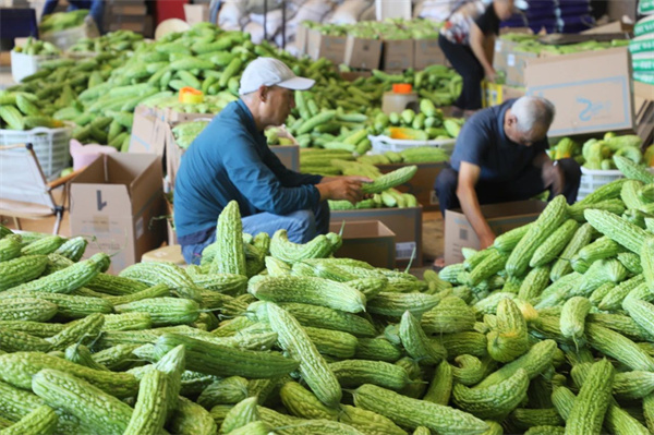 清晨5點(diǎn),基地已是一片繁忙。工人們目光如炬,手起瓜落,動作嫻熟地將符合標(biāo)準(zhǔn)的苦瓜輕放入桶——每一份小心翼翼,都是對創(chuàng)業(yè)果實(shí)最樸素的珍視。“蟲咬的、過熟的,統(tǒng)統(tǒng)歸田作肥,確保品質(zhì)!”基地負(fù)責(zé)人駱輝一邊指揮裝筐,一邊強(qiáng)調(diào)著近乎嚴(yán)苛的標(biāo)準(zhǔn)。他深知,盛夏是苦瓜的黃金期,也是挑戰(zhàn)期:“日采兩萬斤,拼的就是時(shí)效!苦瓜過一天就紅,身價(jià)盡失。我們凌晨開工搶‘鮮’,下午分揀打包,既要搶抓市場的‘窗口’,更要守住品質(zhì)的‘生命線’。” 這份對時(shí)效和品質(zhì)的極致追求,源于他骨子里的創(chuàng)業(yè)基因。這份“苦”差事背后,是駱輝作為創(chuàng)業(yè)者的人文溫度。他細(xì)數(shù)著防暑保障:十滴水、藿香正氣水、清涼油、花露水、綠豆湯、涼茶……“天氣太熱,不能讓工友冒險(xiǎn)。” 從“打工人”到“帶頭人”,他始終記得創(chuàng)業(yè)路上的同行者。