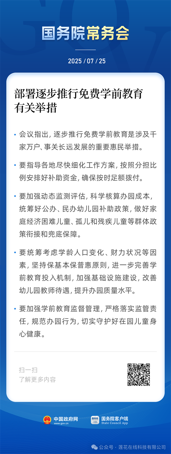 據(jù)新華社消息,7月25日,國(guó)務(wù)院常務(wù)會(huì)議召開(kāi),部署逐步推行免費(fèi)學(xué)前教育有關(guān)舉措。會(huì)議指出,逐步推行免費(fèi)學(xué)前教育是涉及千家萬(wàn)戶(hù)、事關(guān)長(zhǎng)遠(yuǎn)發(fā)展的重要惠民舉措。要指導(dǎo)各地盡快細(xì)化工作方案,按照分擔(dān)比例安排好補(bǔ)助資金,確保按時(shí)足額撥付。要加強(qiáng)動(dòng)態(tài)監(jiān)測(cè)評(píng)估,科學(xué)核算辦園成本,統(tǒng)籌好公辦、民辦幼兒園補(bǔ)助政策,做好家庭經(jīng)濟(jì)困難兒童、孤兒和殘疾兒童等群體政策銜接和兜底保障。要統(tǒng)籌考慮學(xué)齡人口變化、財(cái)力狀況等因素,堅(jiān)持?;颈F栈菰瓌t,進(jìn)一步完善學(xué)前教育投入機(jī)制,加強(qiáng)基礎(chǔ)設(shè)施建設(shè),改善幼兒園教師待遇,提升辦園質(zhì)量水平。要加強(qiáng)學(xué)前教育監(jiān)督管理,嚴(yán)格落實(shí)監(jiān)管責(zé)任,規(guī)范辦園行為,切實(shí)守護(hù)好在園兒童身心健康。