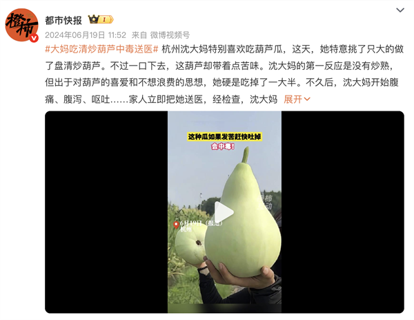 還有人吃了自己種植的瓠子,發(fā)現(xiàn)味苦,只是吃了葫蘆瓜燉的肉,又用沒洗的炒鍋炒茄子,食用后也導(dǎo)致中毒。