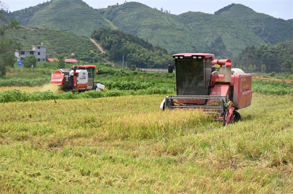 在東源鄉(xiāng)金色的稻浪間,大型聯(lián)合收割機(jī)高效作業(yè),割刀起落,稻粒歸倉,田間轟鳴與農(nóng)戶歡笑交織成豐收樂章。
