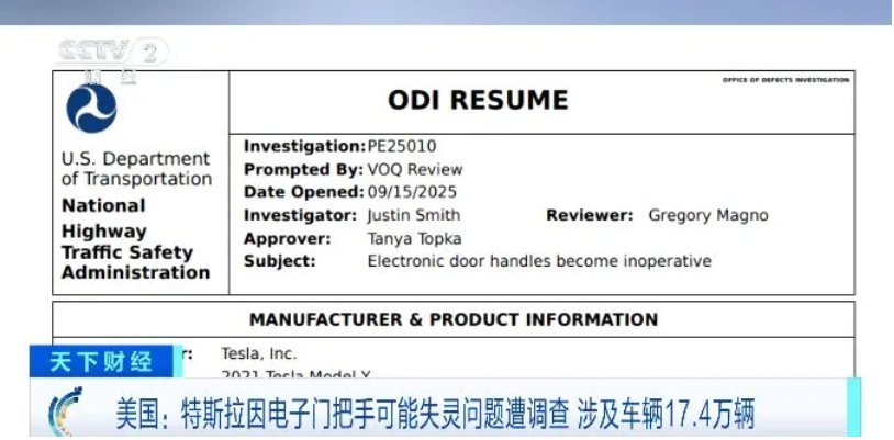 新聞多一點>>9月16日,多家媒體報道,美國相關(guān)機構(gòu)對部分特斯拉電動汽車可能存在“電子門把手失靈”的問題展開調(diào)查,涉及車輛約17.4萬輛。